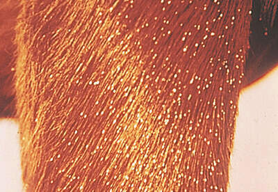 Bot flies can lay eggs on your horse’s mane, shoulders, muzzle or legs. They are small, whitish, nit-like eggs that you can see when grooming your horse, and generally show up in the late summer. Bot larvae can cause gastrointestinal disturbances if your horse ingests them, which can occur if he rubs or chews on his coat where the eggs are attached. The warm, moist breath causes the larvae to hatch and crawl into your horse’s mouth. You can minimize bot infestations by removing the eggs from his hair, but most veterinarians suggest a deworming in the late fall regardless.